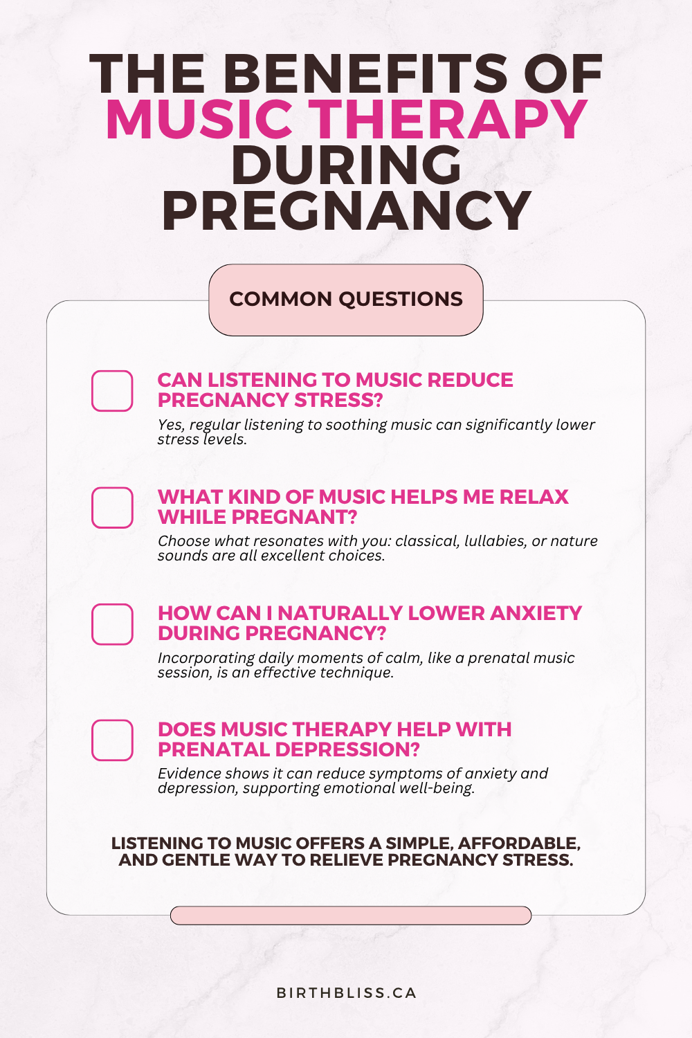 - How can I naturally lower anxiety during pregnancy? Incorporating daily moments of calm, like a prenatal music session, is an effective technique.