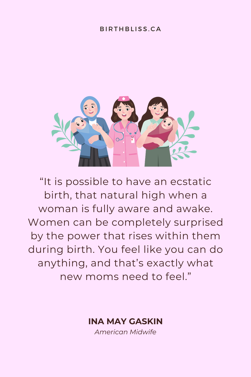 “It is possible to have an ecstatic birth, that natural high when a woman is fully aware and awake. Women can be completely surprised by the power that rises within them during birth. You feel like you can do anything, and that’s exactly what new moms need to feel.”
